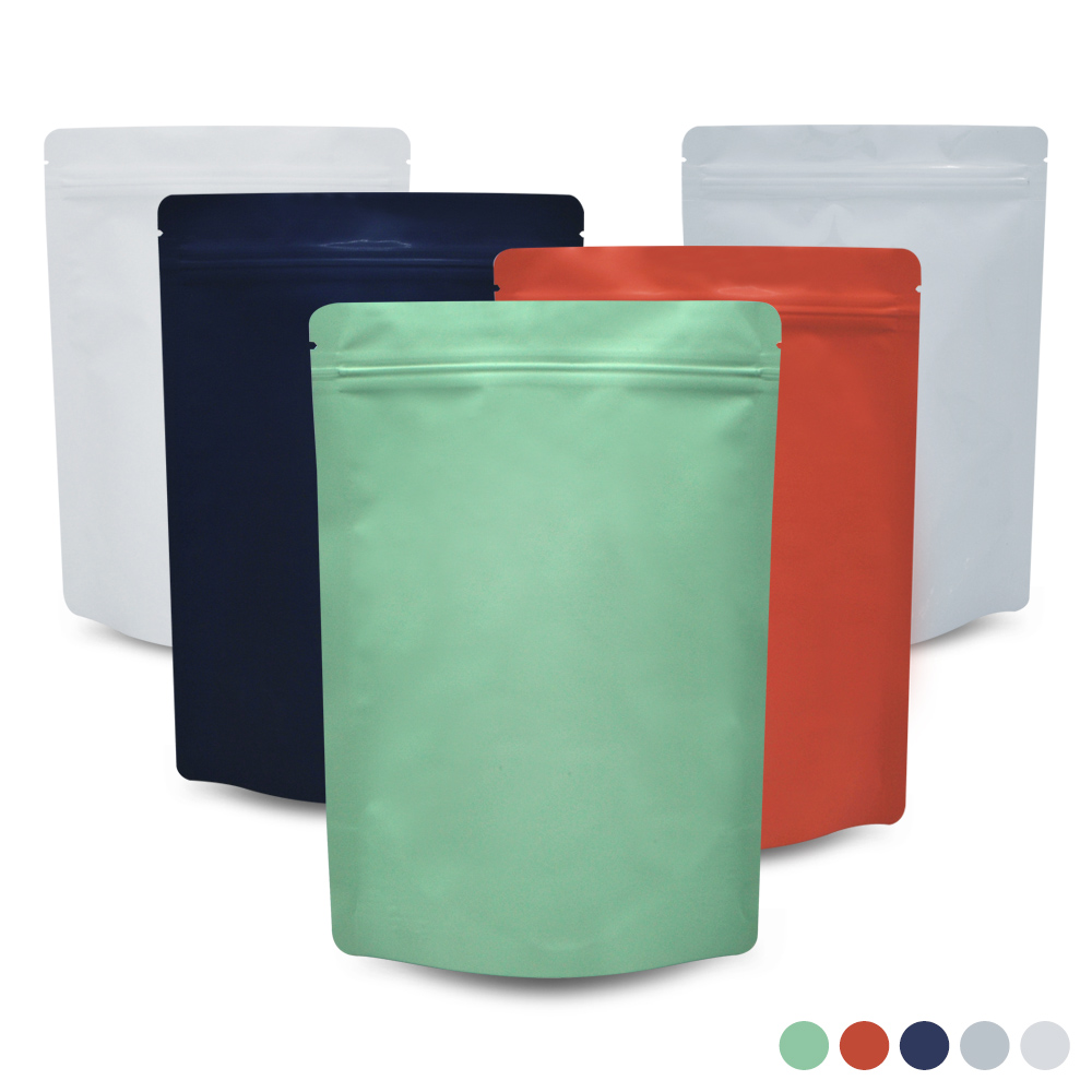 겉면은 무광 컬러 내면은 알루미늄으로 되어있는 스탠드 지퍼백