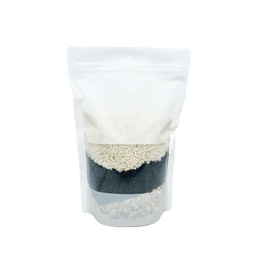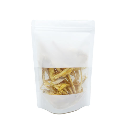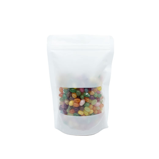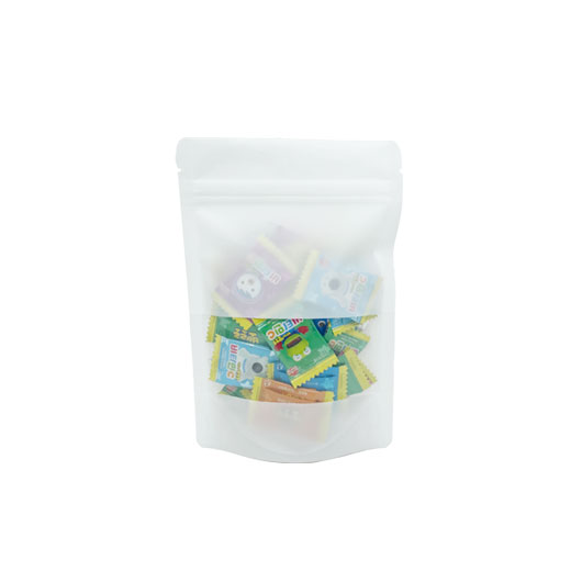 백색무광 바탕에 앞면 사각창이 있어 내용물이 보이는 지퍼스탠드