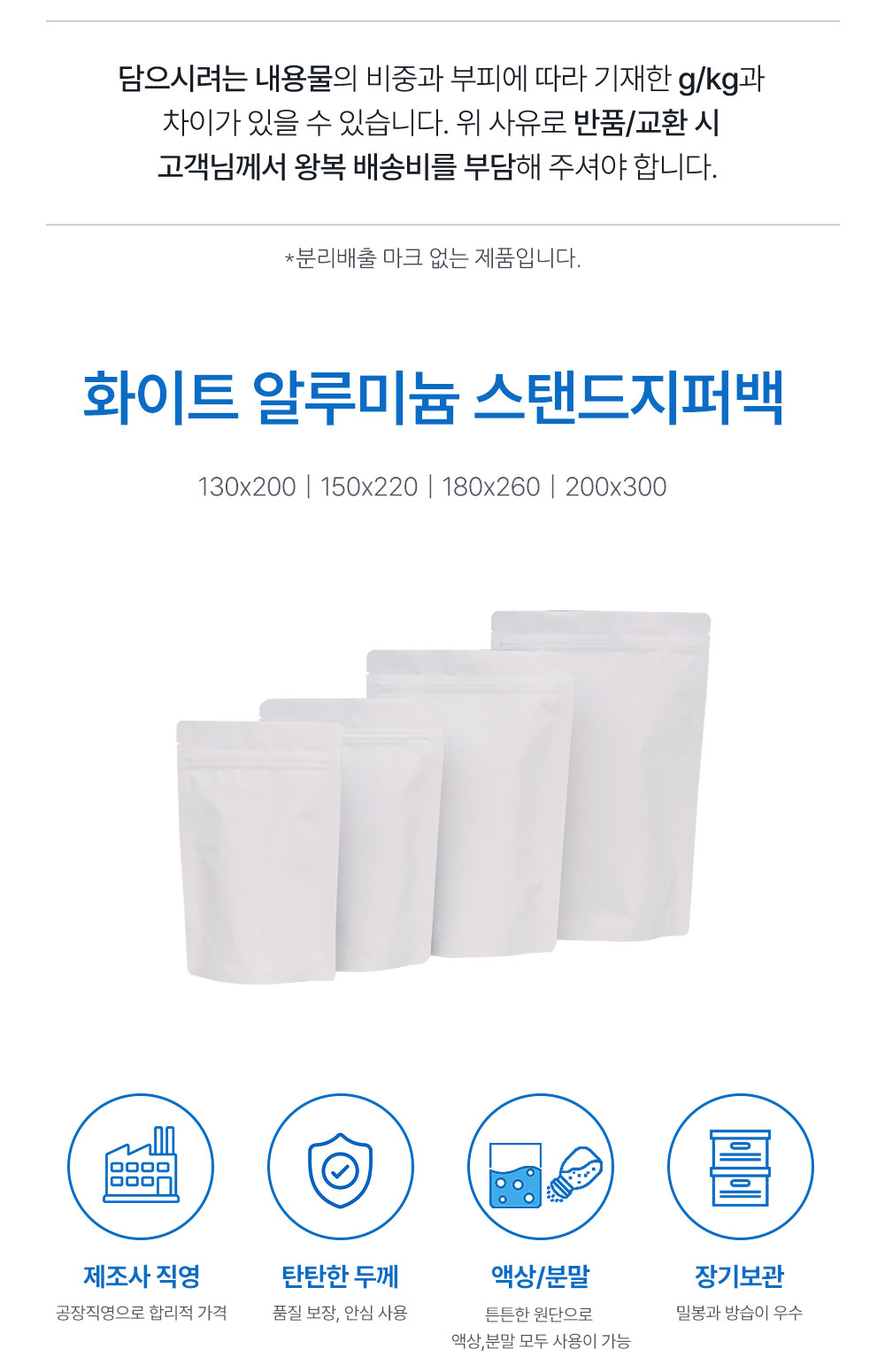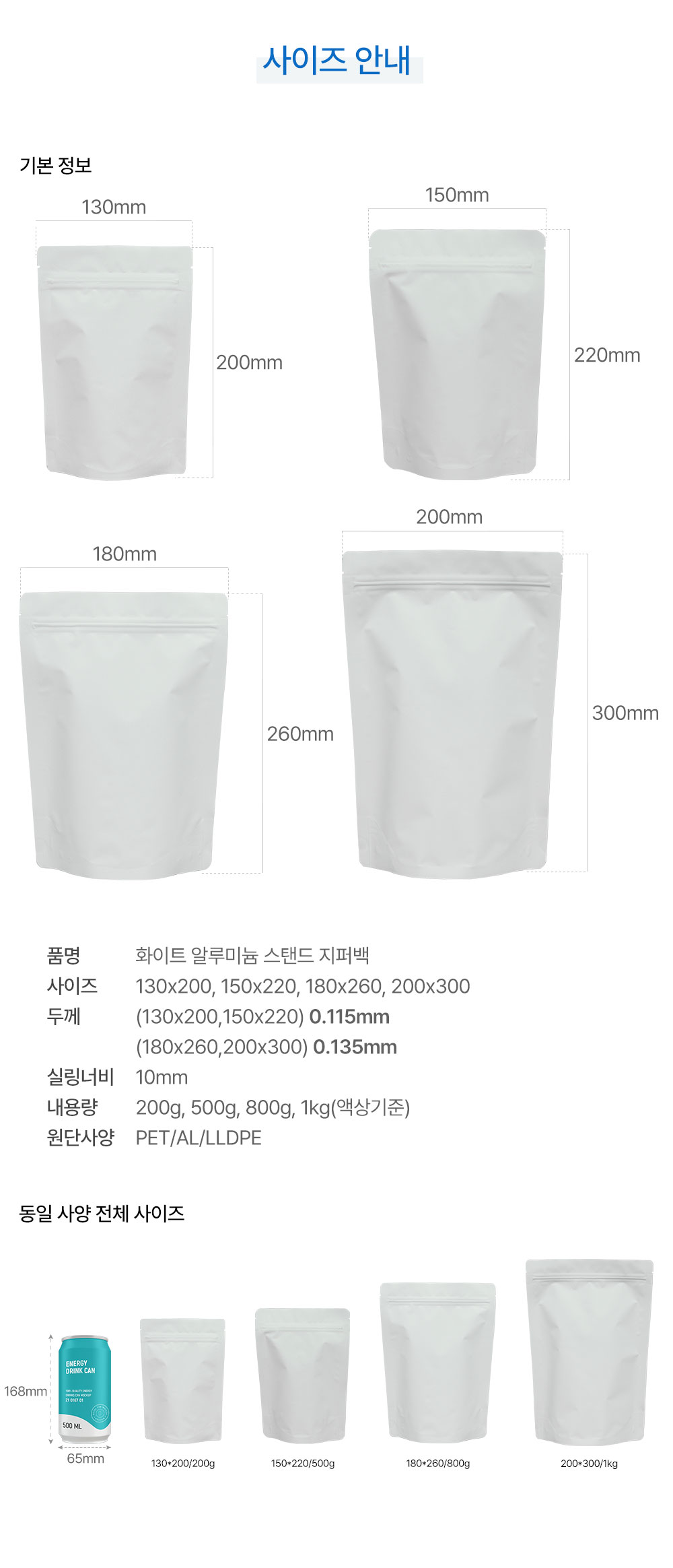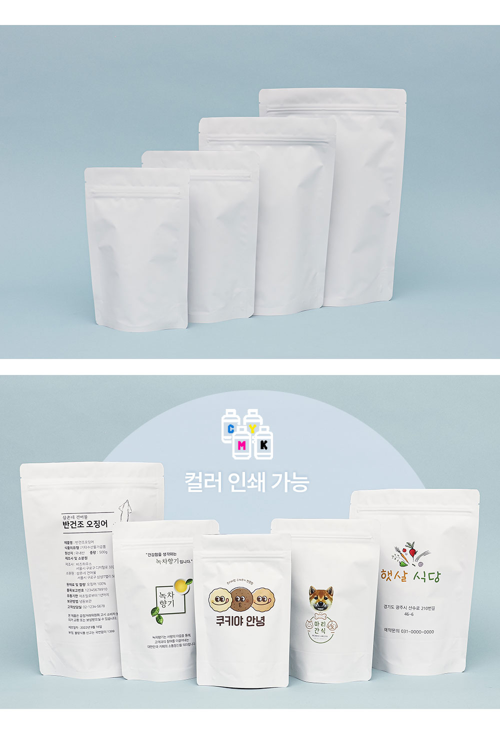 사이즈 4가지|겉면은 화이트 컬러 내면은 알루미늄으로 되어있는 스탠드 지퍼백