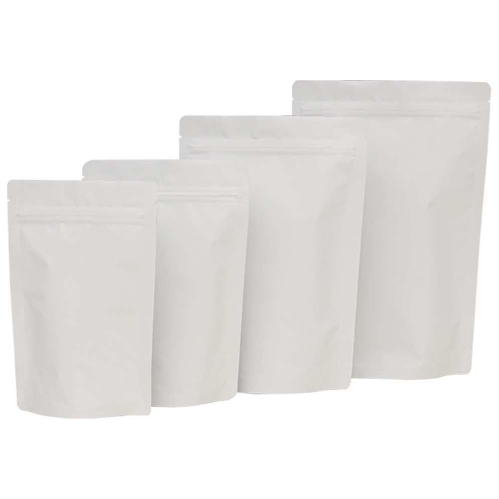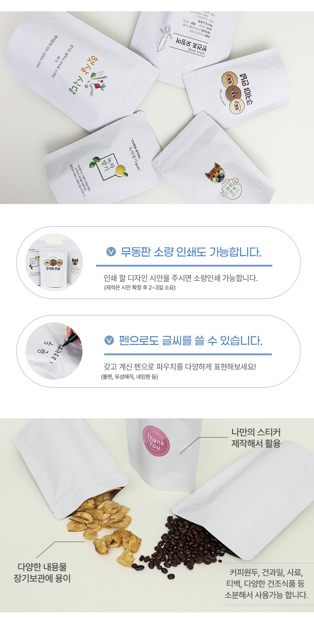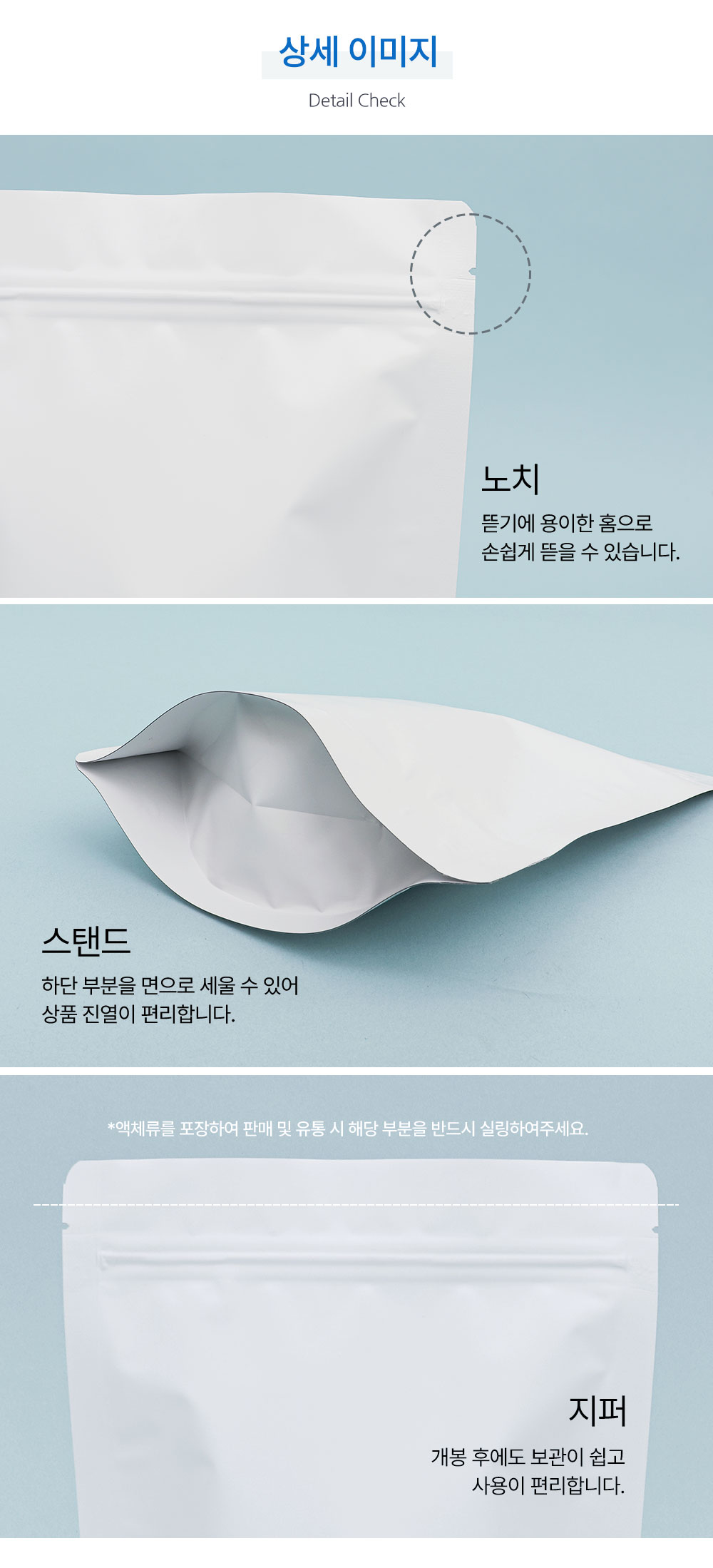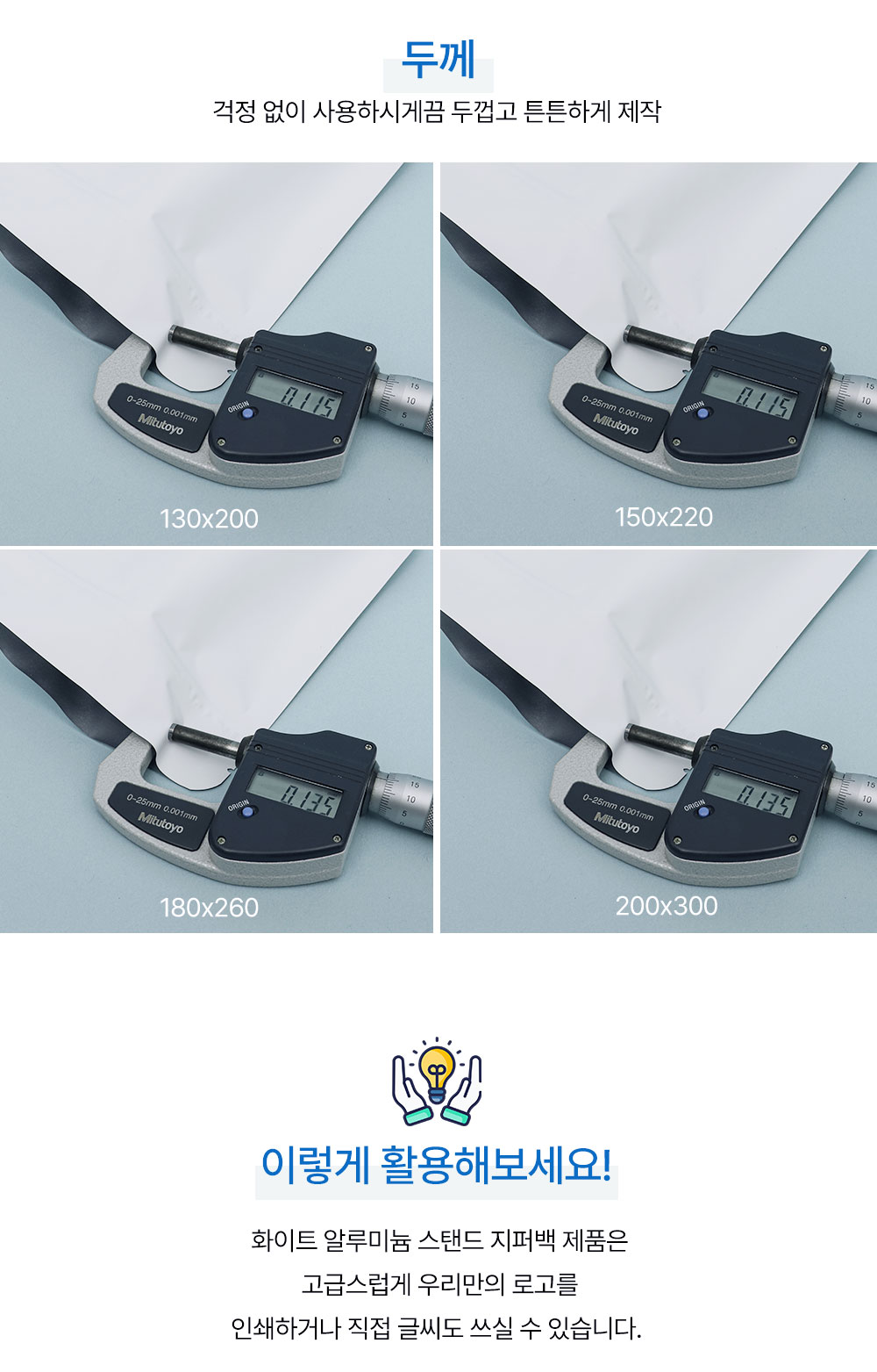 사이즈 4가지|겉면은 화이트 컬러 내면은 알루미늄으로 되어있는 스탠드 지퍼백