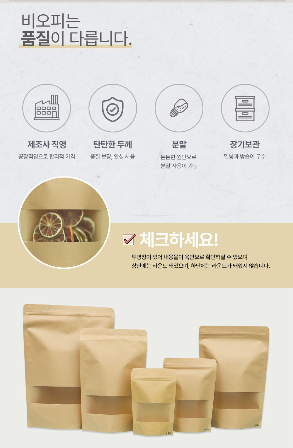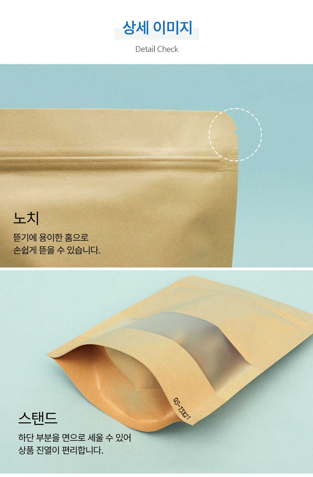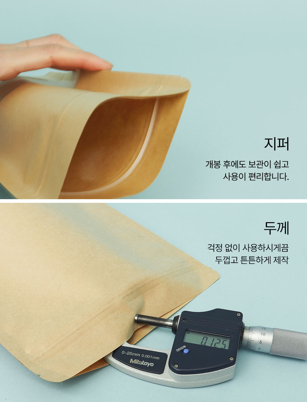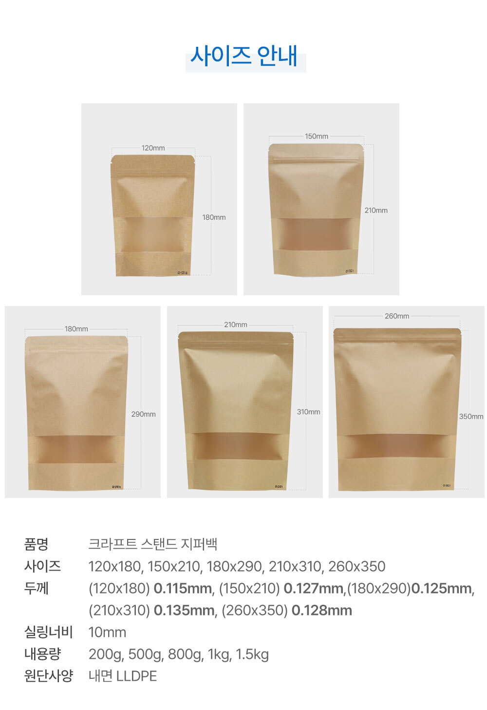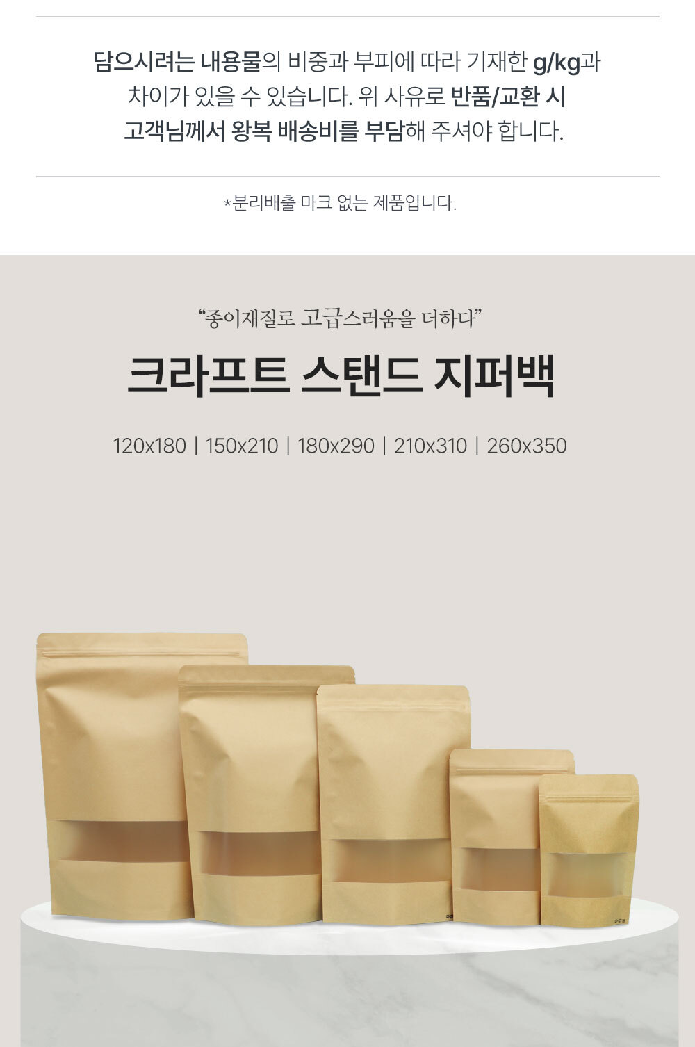 사이즈 4가지|겉면은 크라프트 종이재질의 스탠드 지퍼백